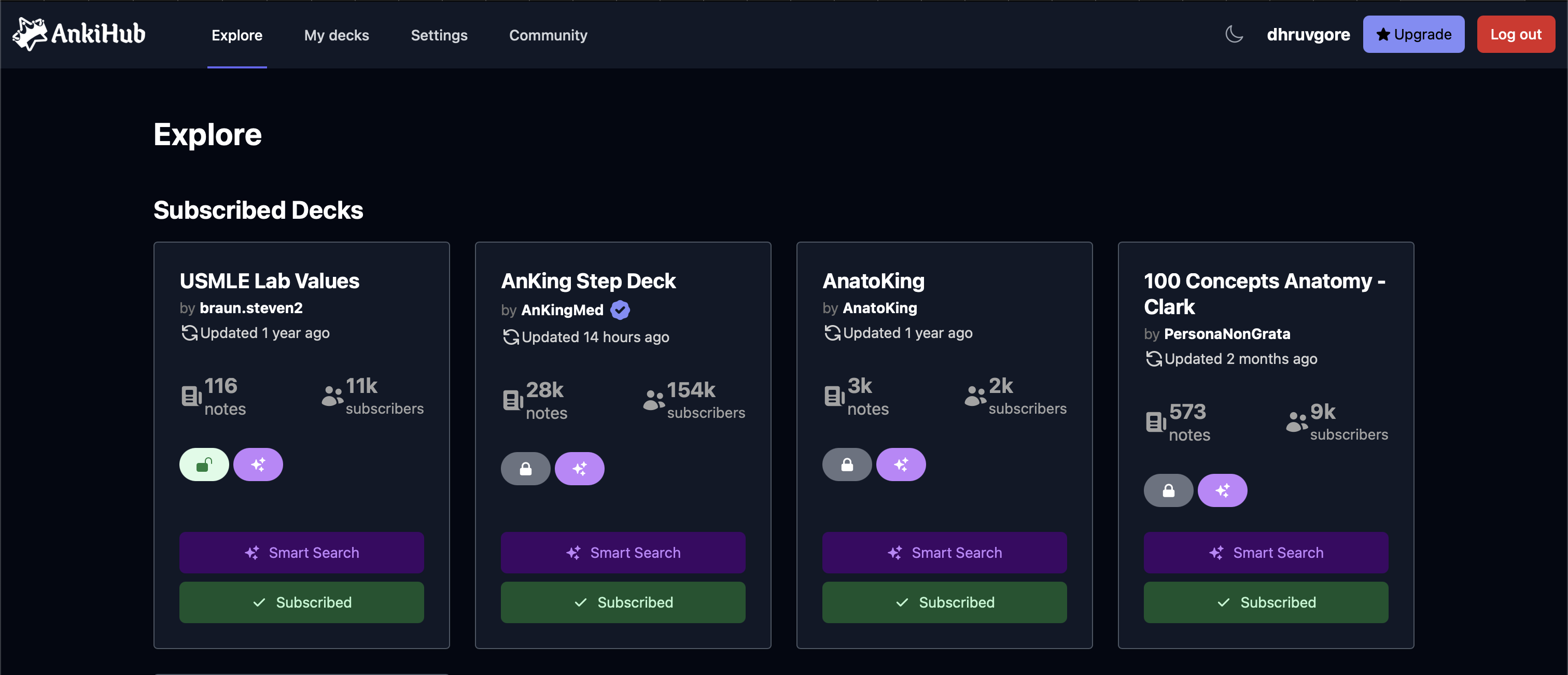 Top 10 Dominance: Of the top 10 most-subscribed decks on AnkiHub, 90% are medical-specific (USMLE, MCAT, Anatomy, EKG, and Dermatology).
