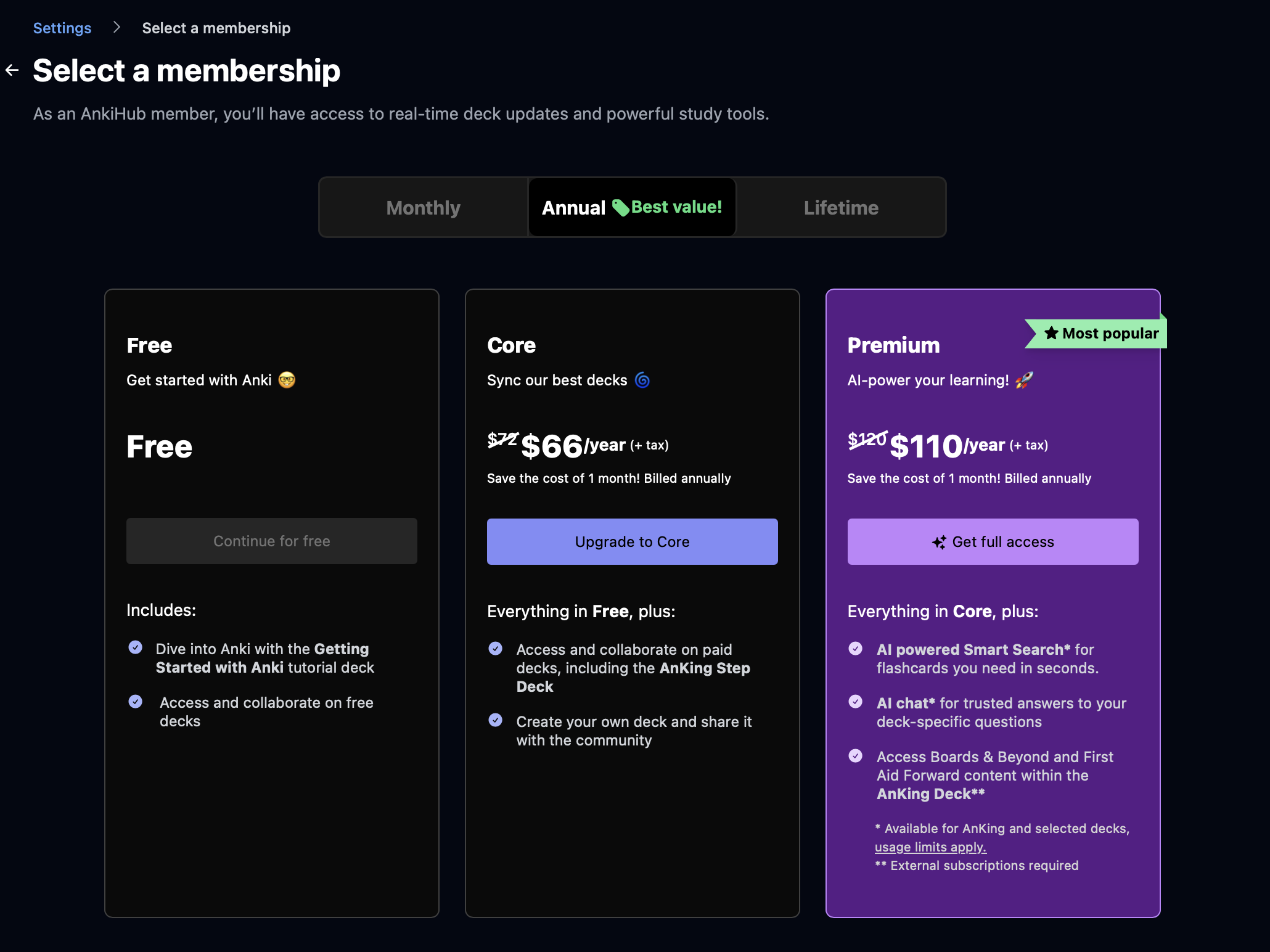 Ankihub’s current pricing, with lifetime pricing at $450 USD.