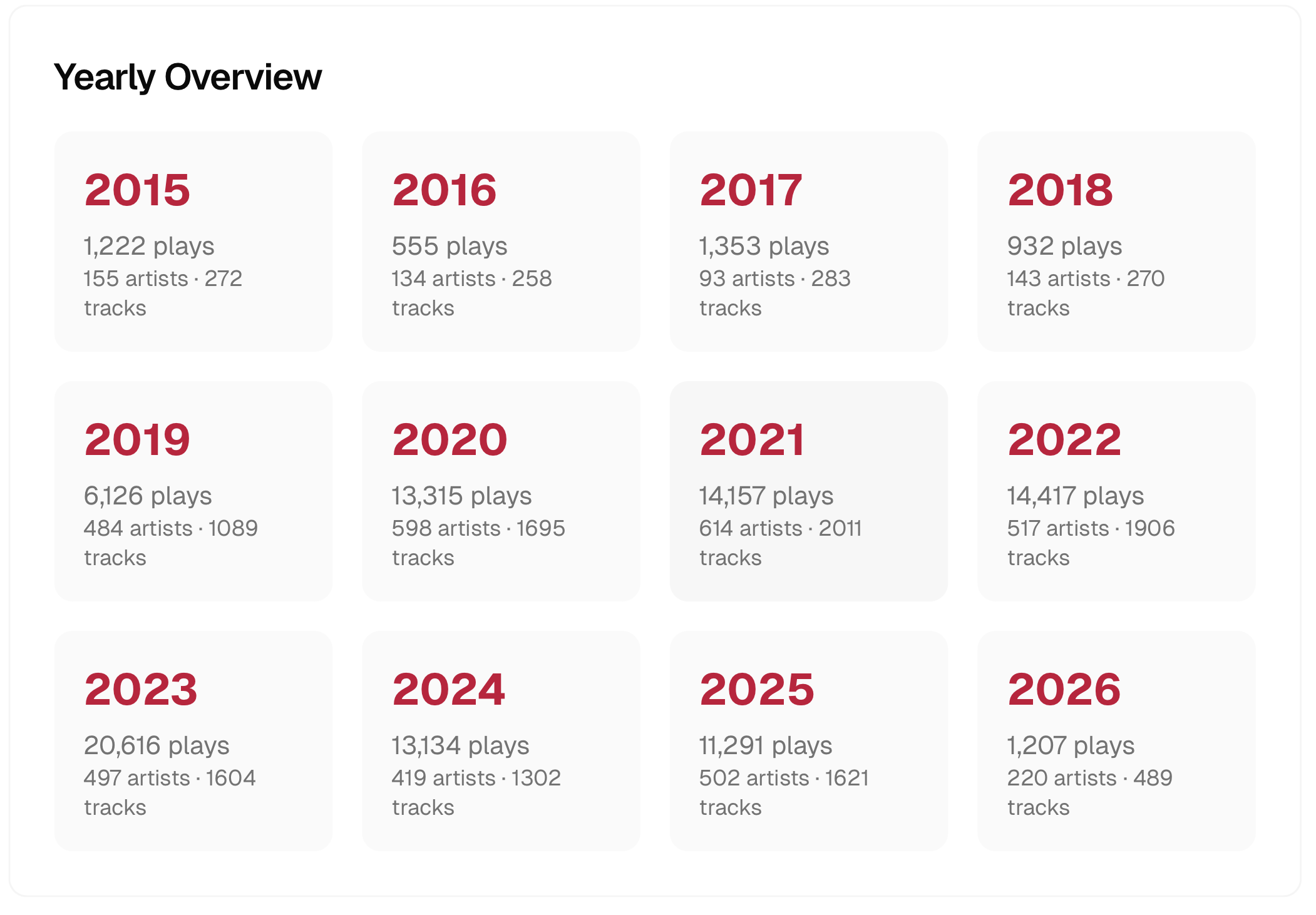 - This one was interesting, I’ve had Spotify premium since 2019 which is when my listening went up significantly. I had tried to cut down in 2025, but overall it was similar to other years.