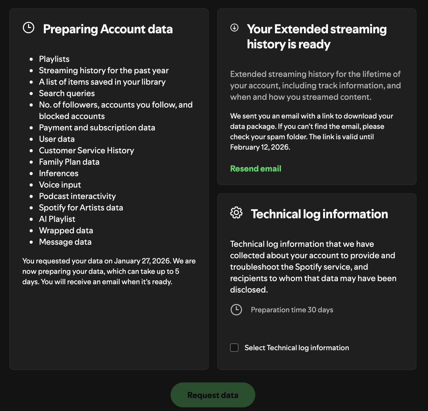 Spotify allows you to request your account data alongside your full listening history for the entirety of your account.