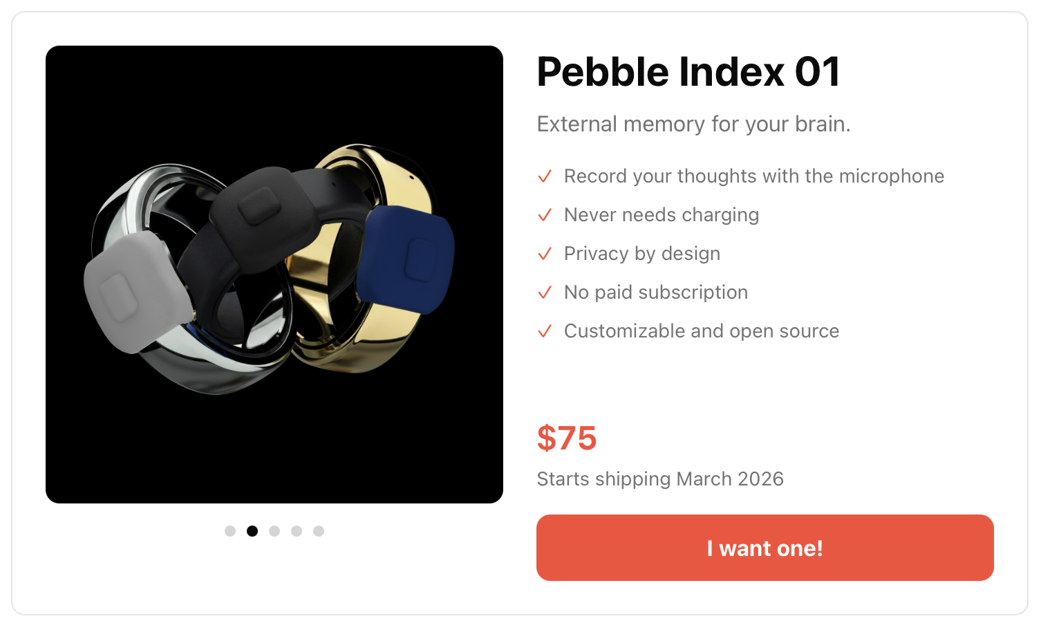 Sandbar’s ring basically has everything I want (press to record/capture thoughts/audio, music controls, potentially shortcut integrations), I would preorder if I had the money!