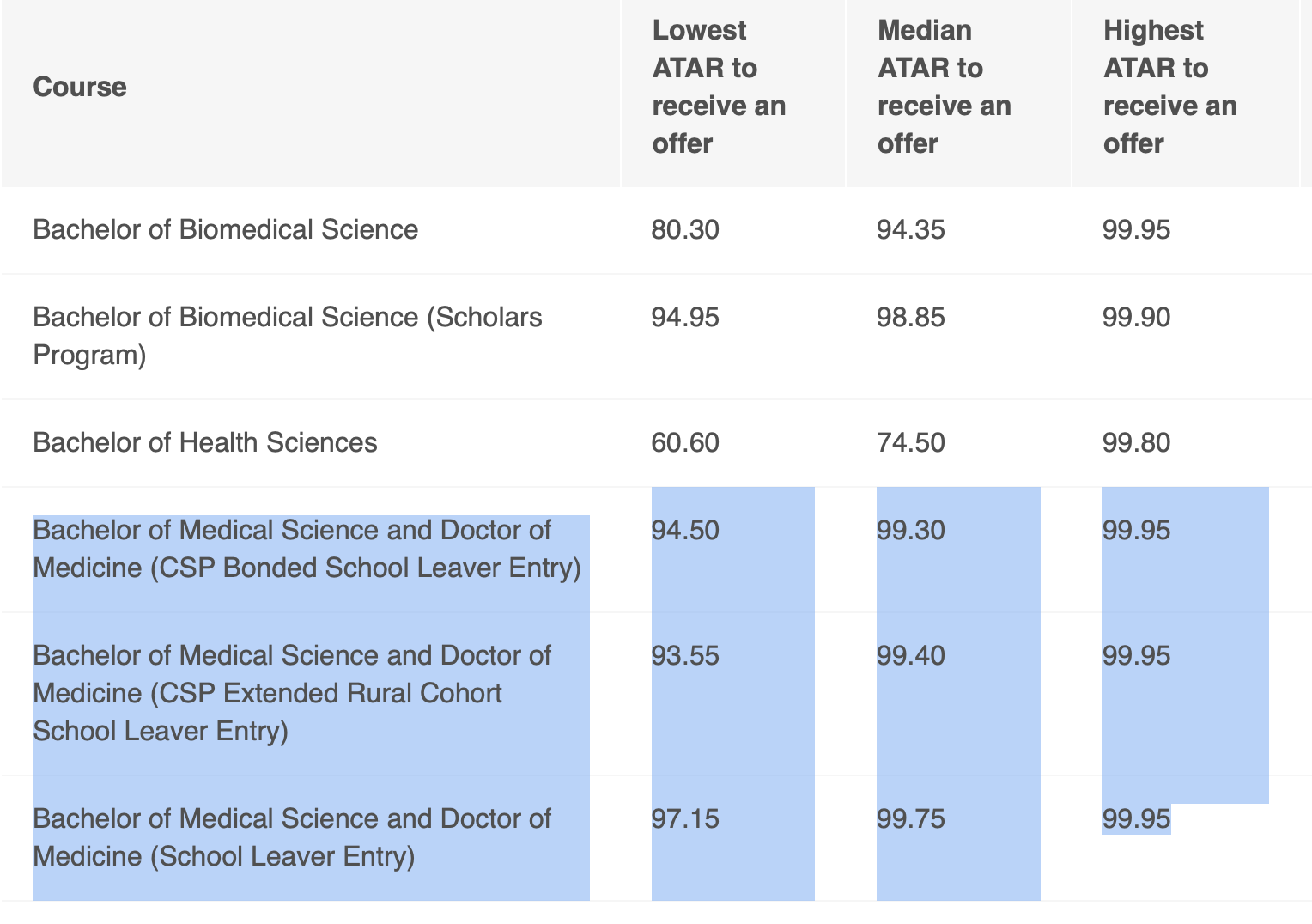 For the standard medicine stream, the median ATAR (Australian tertiary admissions rank in percentiles) offered was 99.75.