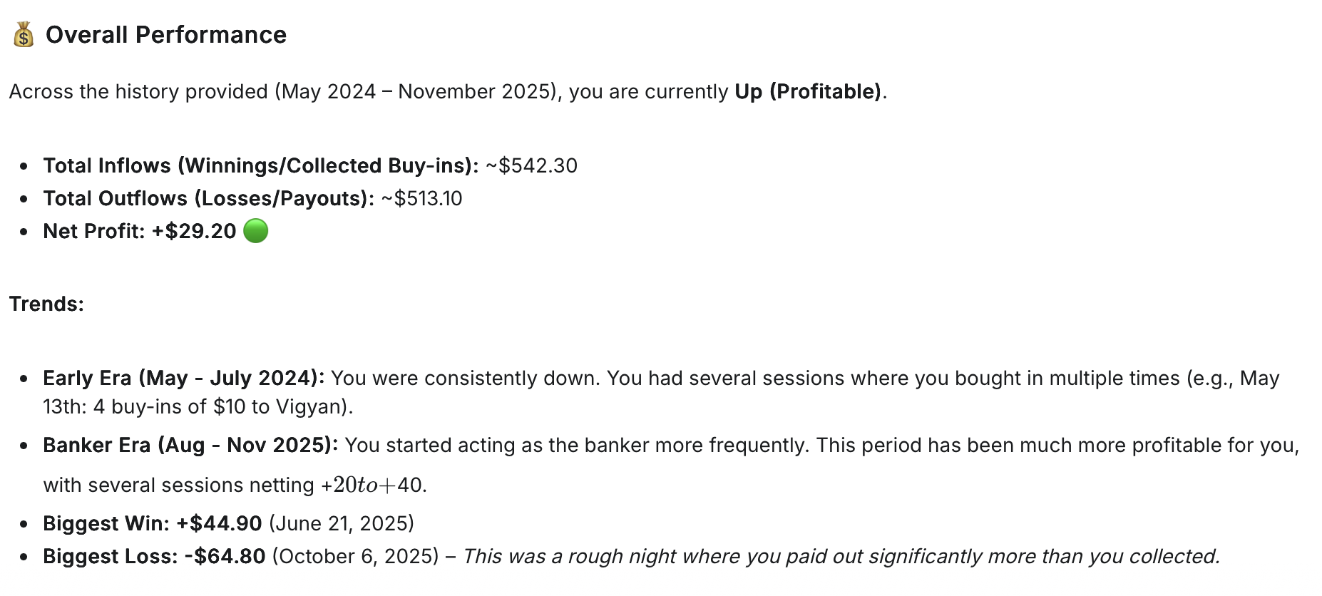 Recently I was curious how much up/down I am playing poker with my friends. It was extremely easy using my past transactions and AI to figure out every game i’ve ever played and calculate from there.